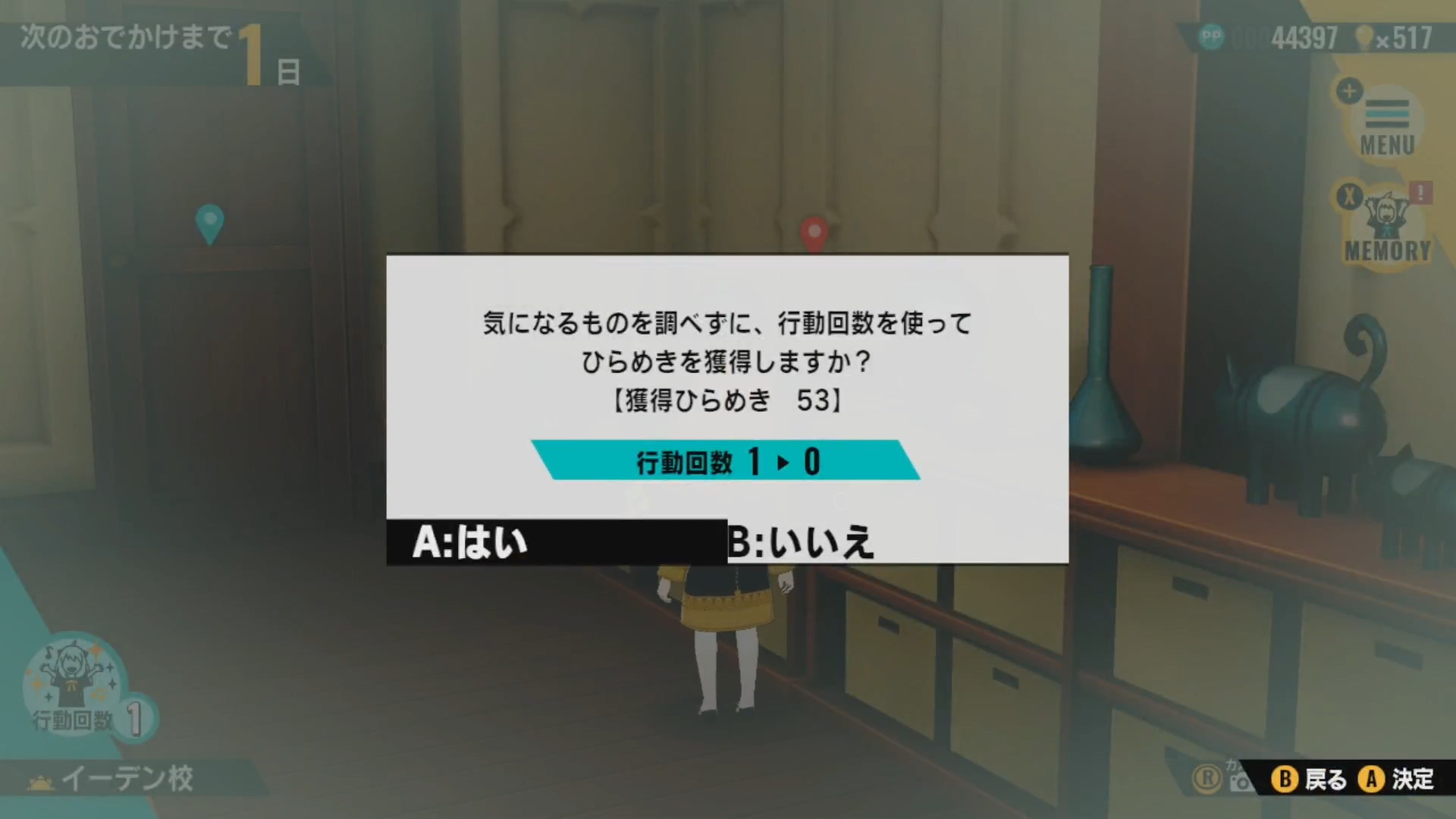 일상에서는 이미 사진을 촬영한 포인트에서, 미니게임은 일정 이상 플레이를 했을 때에, 최소한의 보상만 받고 턴을 넘기는 것이 가능한데, 이렇게 받는 보상이 일상이나 미니게임을 직접 진행했을 때 받는 보상보다 아주 부족하지도 않을 뿐 더러 이렇게 받은 보상만으로도 엔딩을 보는데 전혀 지장이 없다보니 재화가 조금만 모이면 외출을 제외하고는 사진 촬영과 미니게임을 할 필요 없이 스킵만 반복해서 진행이 가능한 정도입니다.