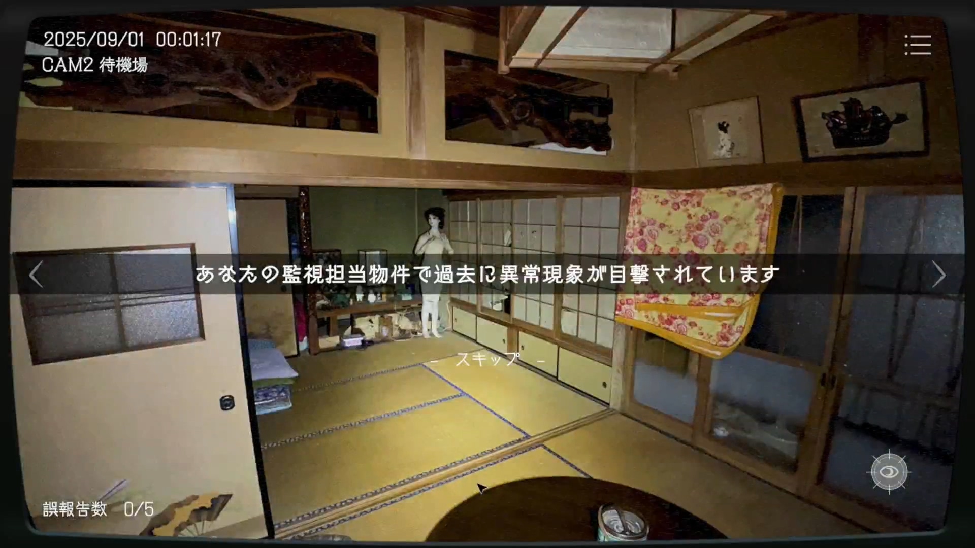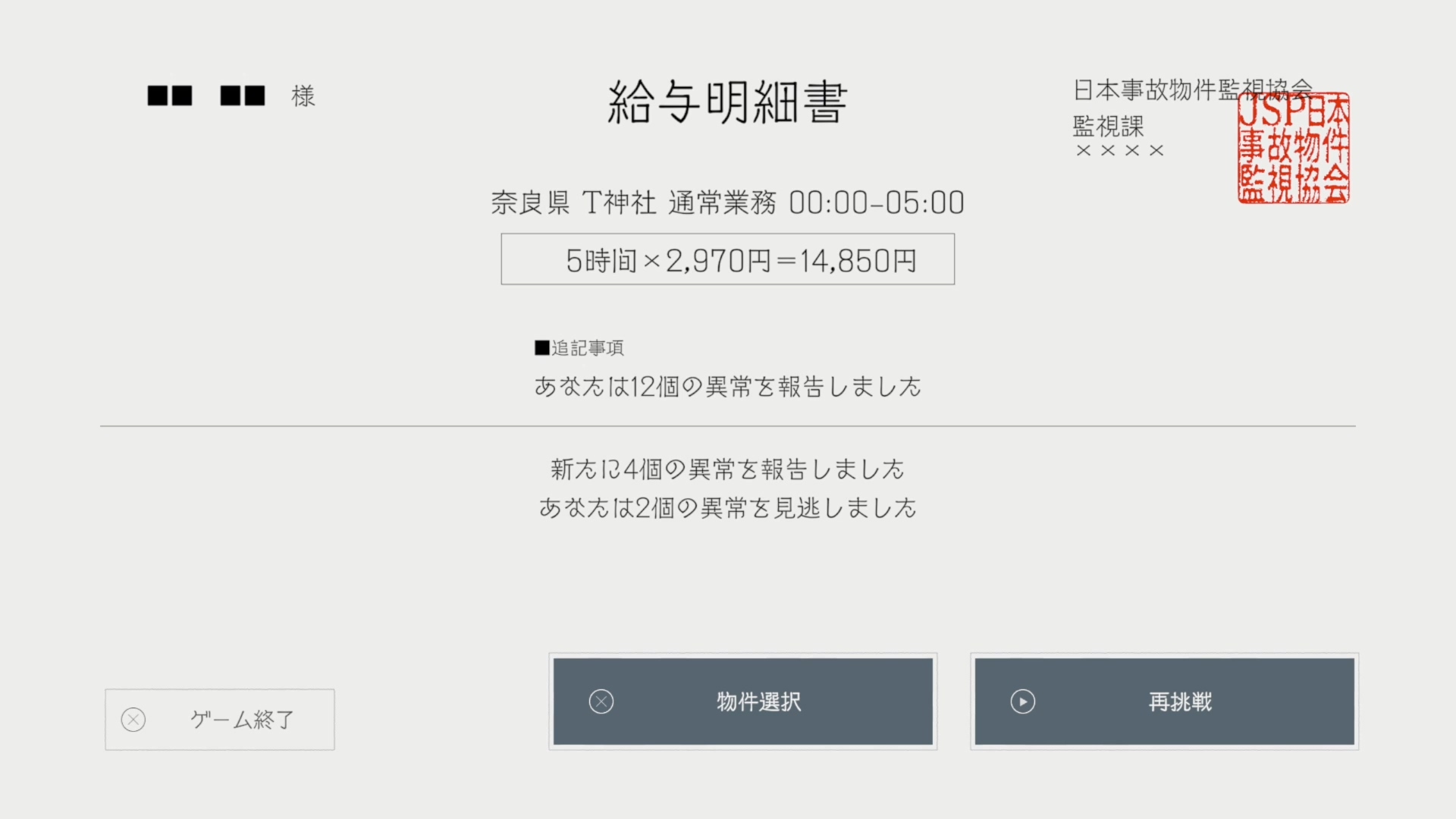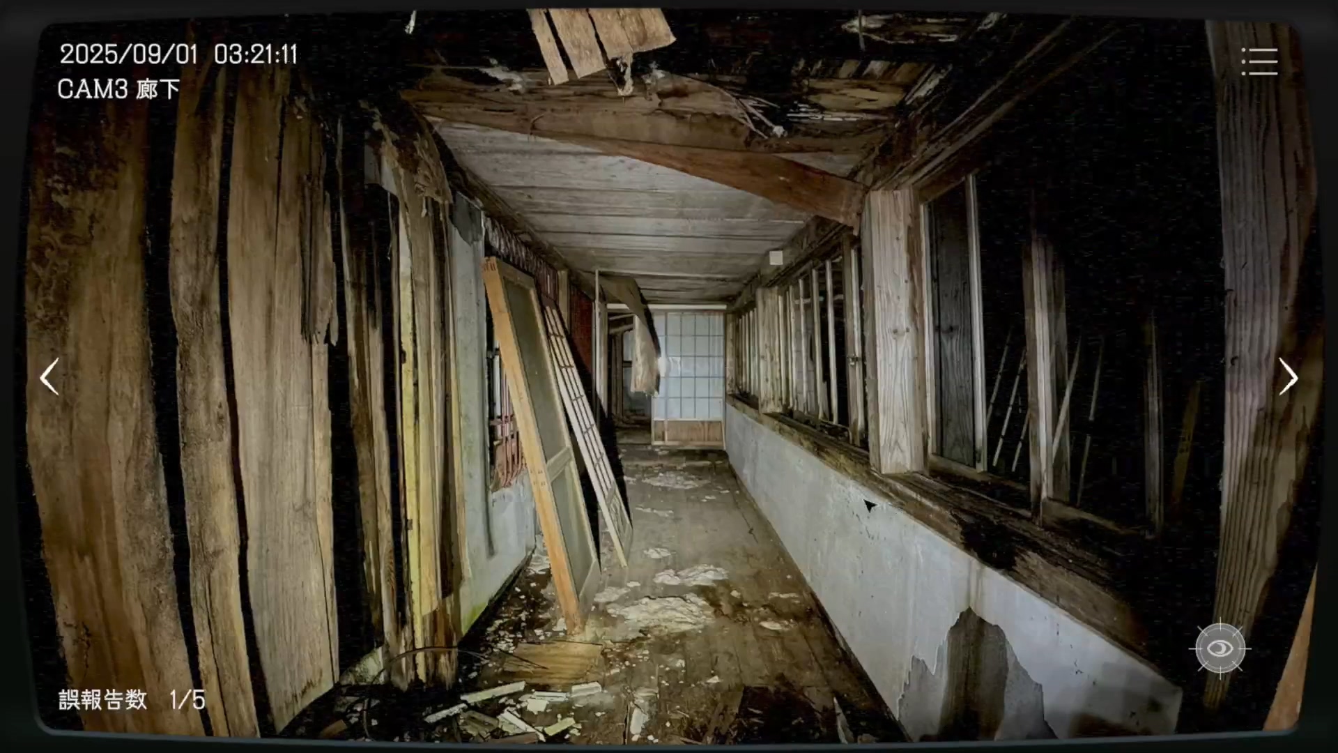 새벽 5시까지 버티며 이상 현상을 최대한 찾아내면 클리어로 처리되는데, 보고한 이상 현상과 더불어 새로 찾아내거나 놓친 이상 현상이 몇 개나 되는지도 알려주는데, 어떤 것을 놓쳤는지는 알려주지 않습니다. 오히려 클리어를 실패했을 때에 어떤 이상 현상이 어느 캠에 있었는지 간접적으로 알려주고 있습니다.